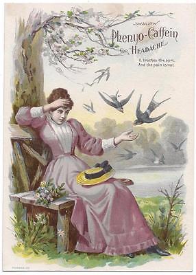 Pheno- Caffein For Headaches - Trade Card - Swallows - Forbes Co. Lith