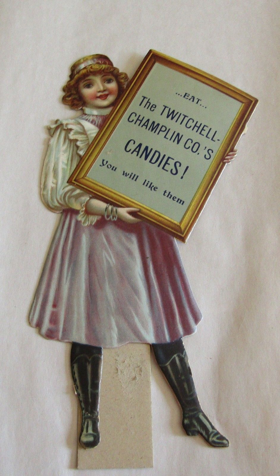 Victorian Die Cut Advertising Card ~ Pretty Girl ~ Twitchell - Champlin Candies