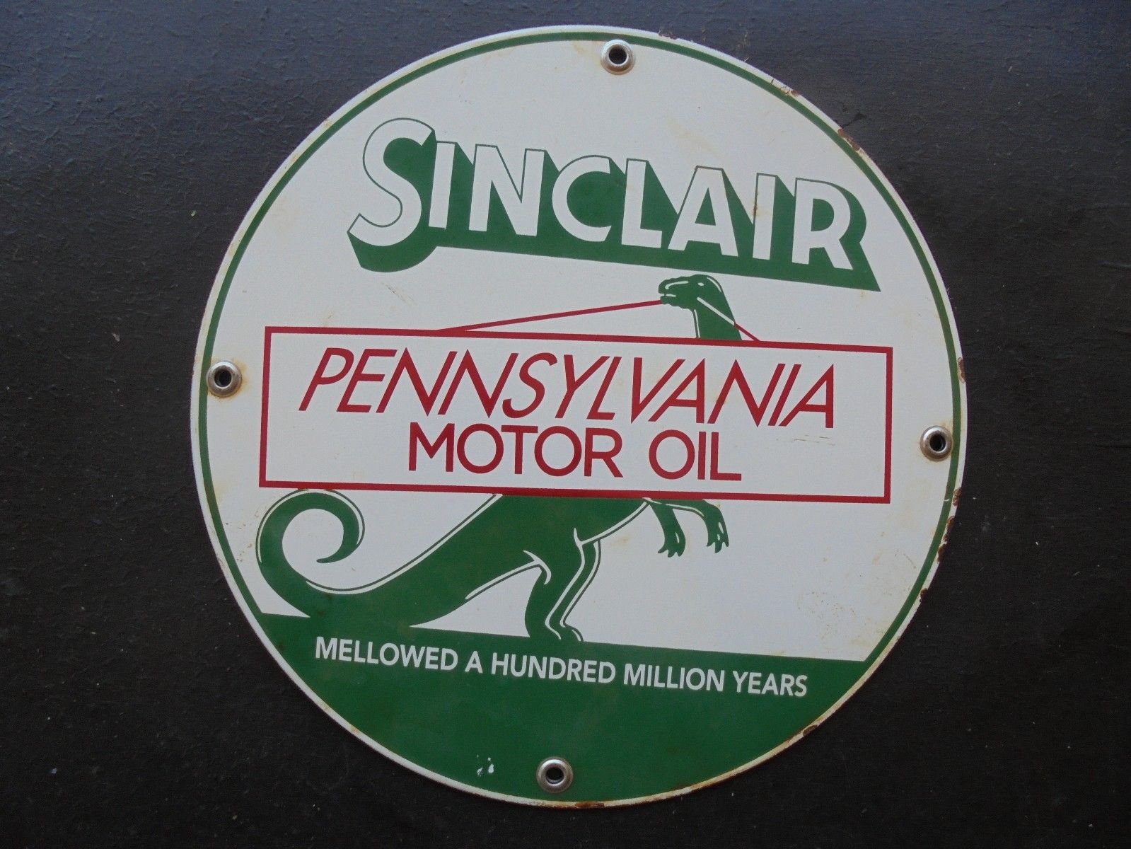 Sinclair Pennsylvania Motor Oil porcelain pump plate sign Dino garage can lube