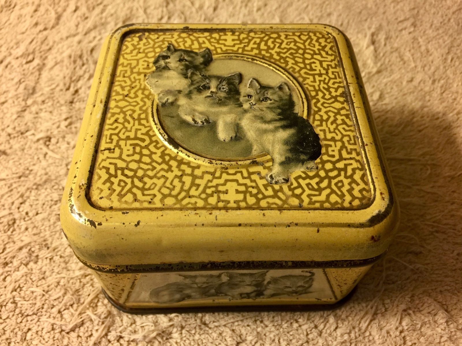 Title (ebay affiliate link): Dutch Antique Biscuit Candy Tin Cat Kitten Vintage 1920s 1930s Litho Advertising