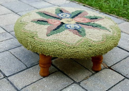 Title (ebay affiliate link): Footstool Ottoman round rug hook wood Cottage shabby vintage chic Victorian