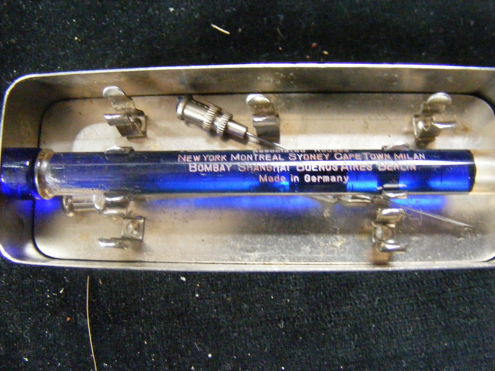 Vintage medical equipment doctor surgery blue glass syringe & needles Burroughs
