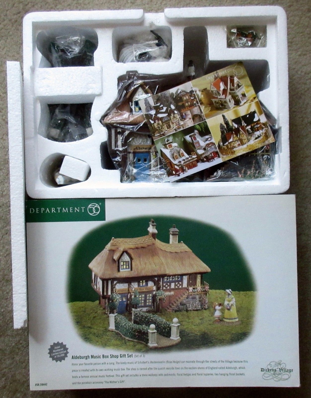 Title (ebay affiliate link): DEPT 56 DICKENS VILLAGE "ALDEBURGH MUSIC BOX SHOP GIFT SET" 3 PCS MUSIC WORKING