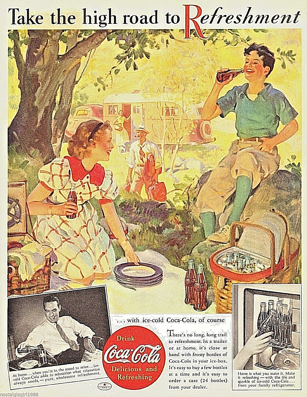 Title (ebay affiliate link): 1937 Coca-Cola coke picnic family trailer art illustration print ad 10.5"x13.5"