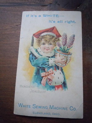 ANTIQUE VICTORIAN WHITE SEWING MACHINE ADVERTISING CARD GIRL WITH HYACINTHS