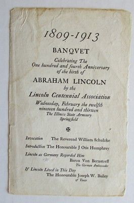 Title (ebay affiliate link): Lincoln Centennial Commission Banquet Menu 1913 Abraham Lincoln Springfield IL