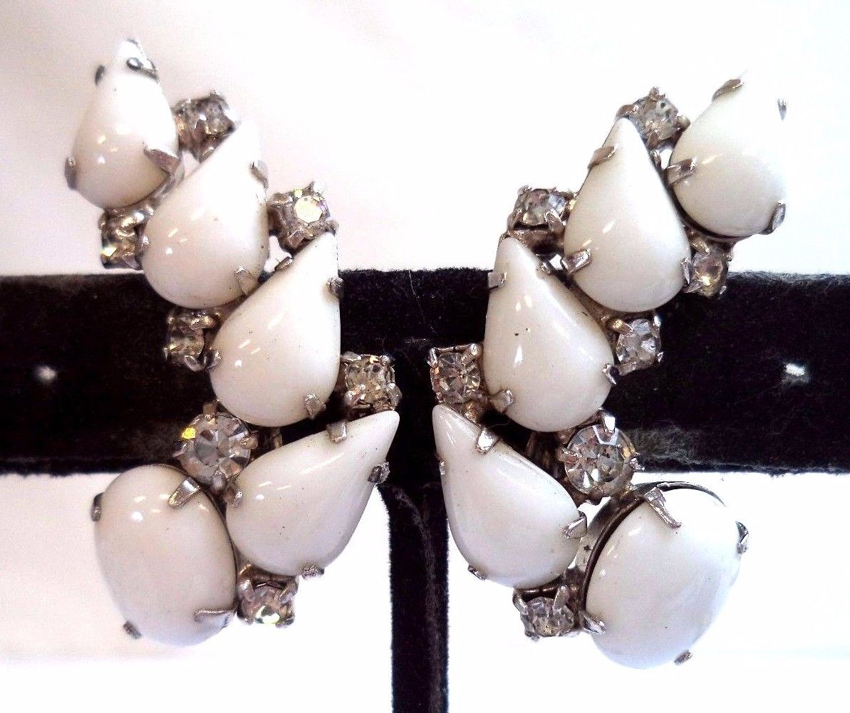 Title (ebay affiliate link): VINTAGE ESTATE HIGH END MILK GLASS RHINESTONE FLOWER 1 1/2" CLIP EARRINGS G6467B