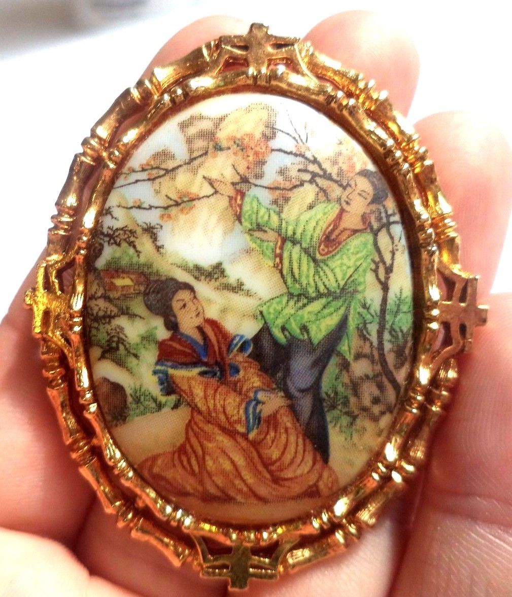 Title (ebay affiliate link): STUNNING VINTAGE ESTATE SIGNED ART MILK GLASS ASIAN 2 1/8" BROOCH! 7569O