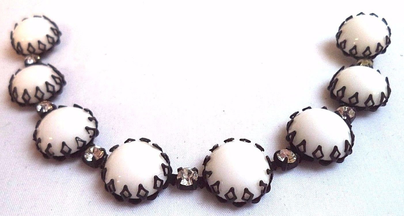 VINTAGE ESTATE MILK GLASS BLACK ENAMEL FLOWER RHINESTONE 7 3/8" BRACELET! G6472D