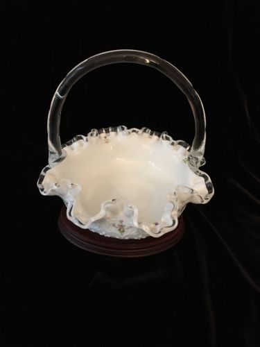 Title (ebay affiliate link): Fenton Signed Milk Glass Violets in the Snow Spanish Lace Silver Crest Basket