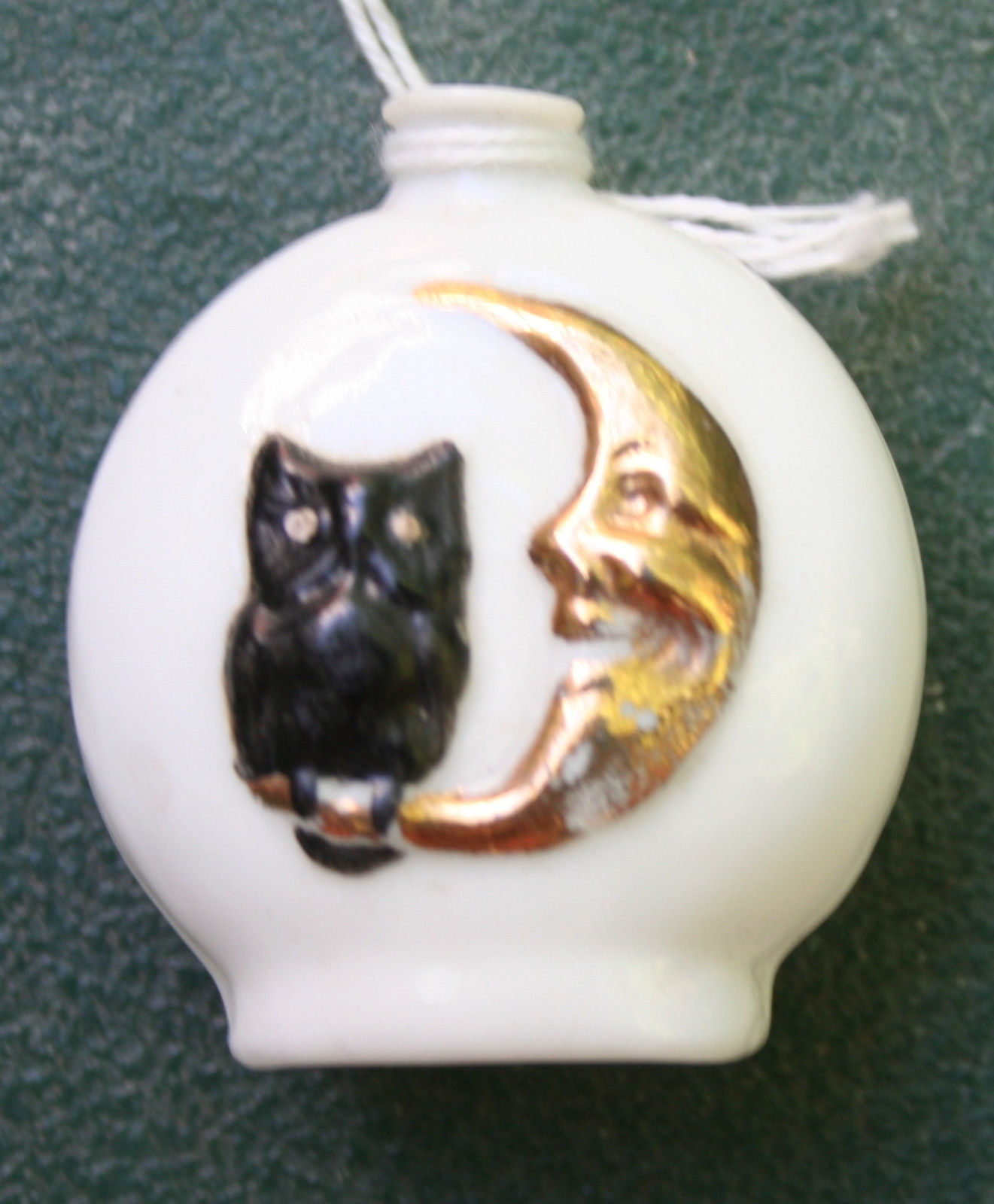 Title (ebay affiliate link): Halloween Milk Glass Perfume Bottle, Owl Perches on Smiling Golden Moon,Germany