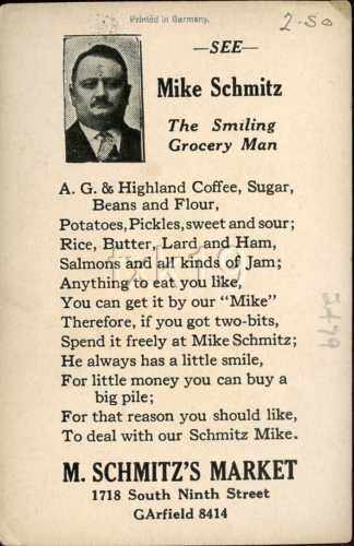 Title (ebay affiliate link): M SCHMITZ''S MARKET ~ Mike Schmitz The Smiling Grocery Man Advertising Card 2479v