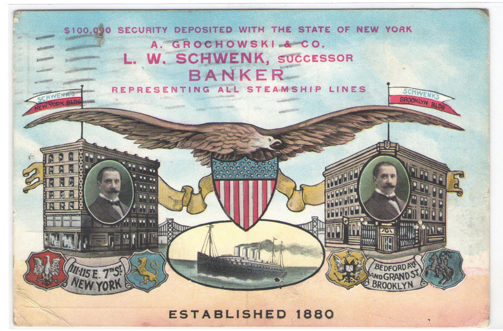 FMRA NEW YORK GROCHOWSKI & CO BANKER STEAMSHIP LINES SCHWENK POSTCARD sg200