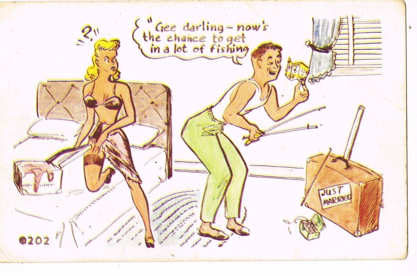 Title (ebay affiliate link): ANTIQUE COMIC Postcard COUPLE IS JUST MARRIED - HUSBAND WANTS TO GO FISHING