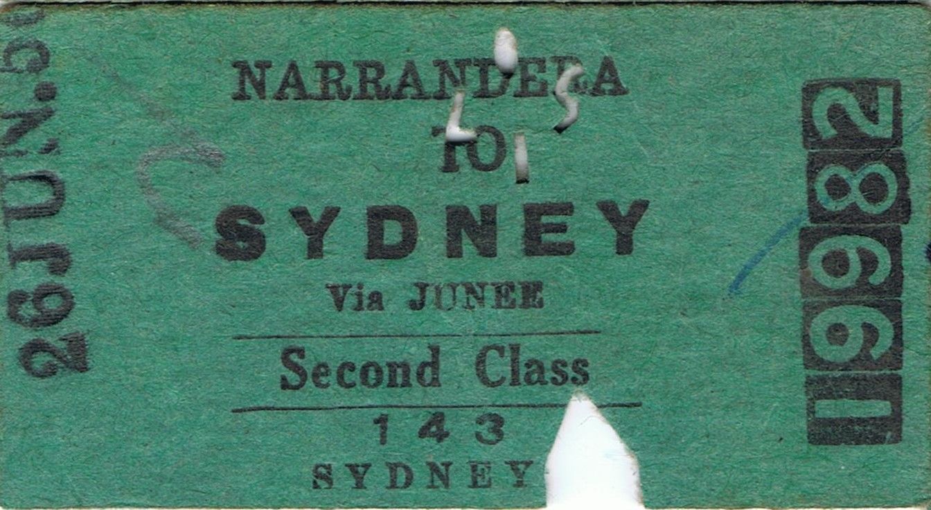 Railway ticket a trip from Narrandera to Sydney by the old NSWGR in 195?