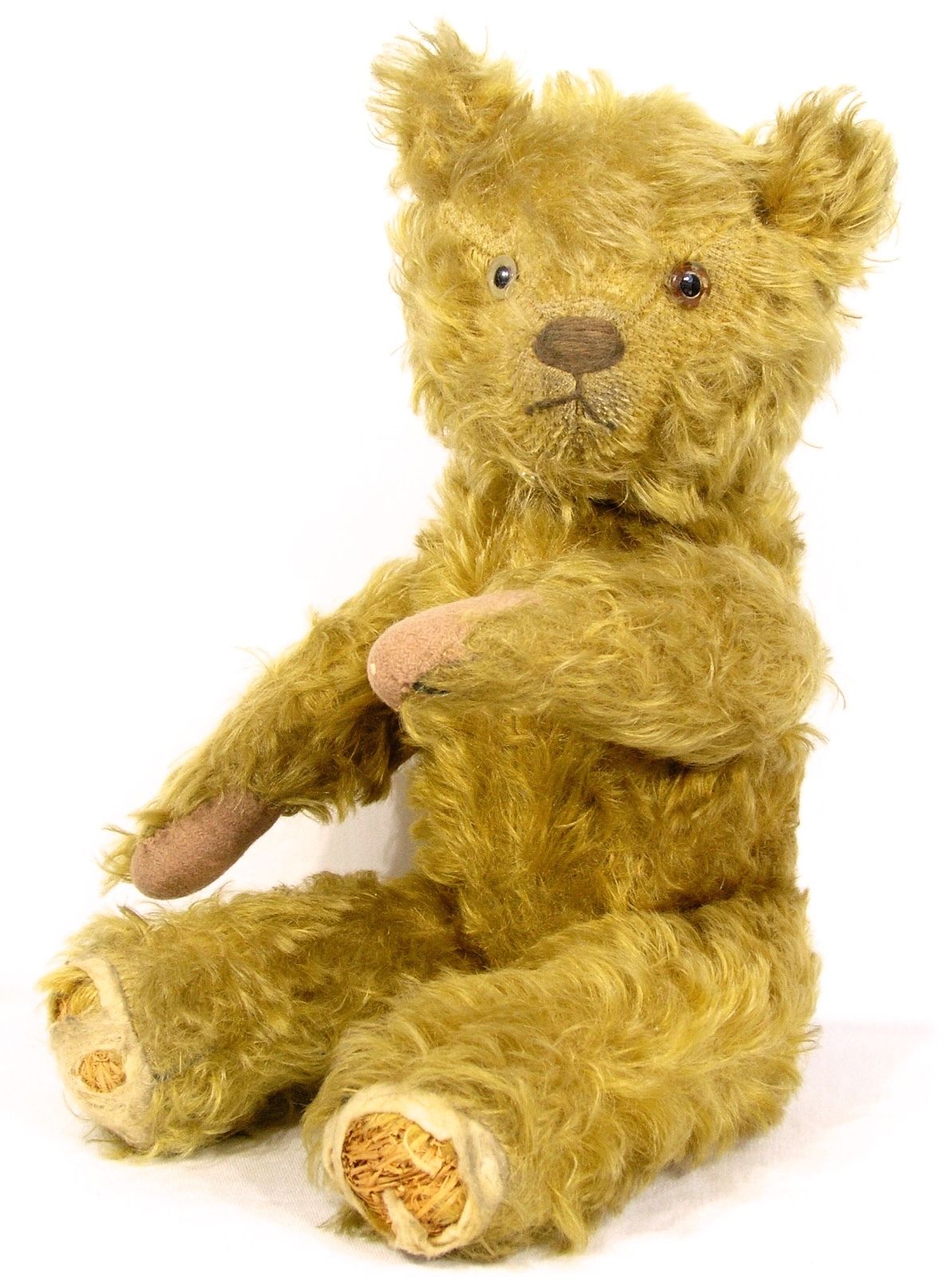 Title (ebay affiliate link): Antique Golden Teddy Bear Jointed Straw Filled Growler Ideal Schuco Steiff Era