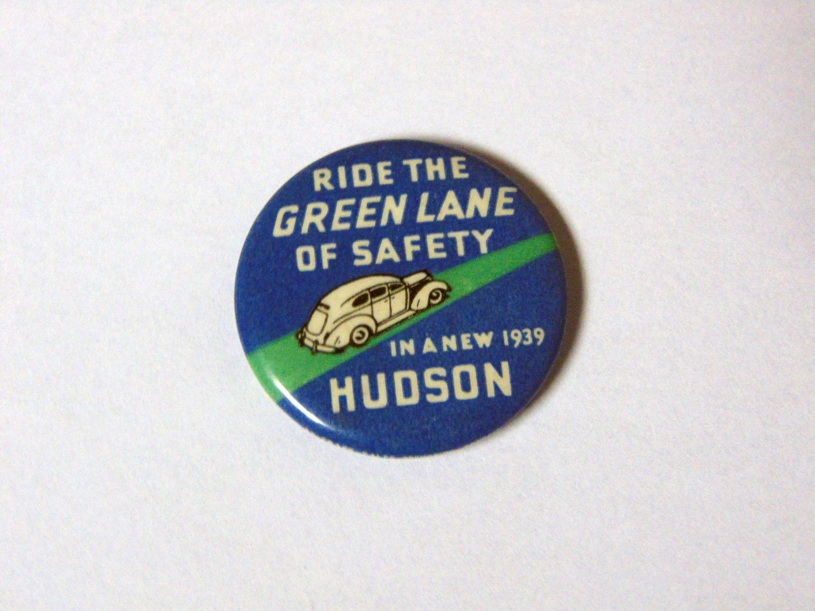 Nice 1939 Hudson GREEN LANE SAFETY Pin Pinback Button FREE S&H IN A SECURE BOX