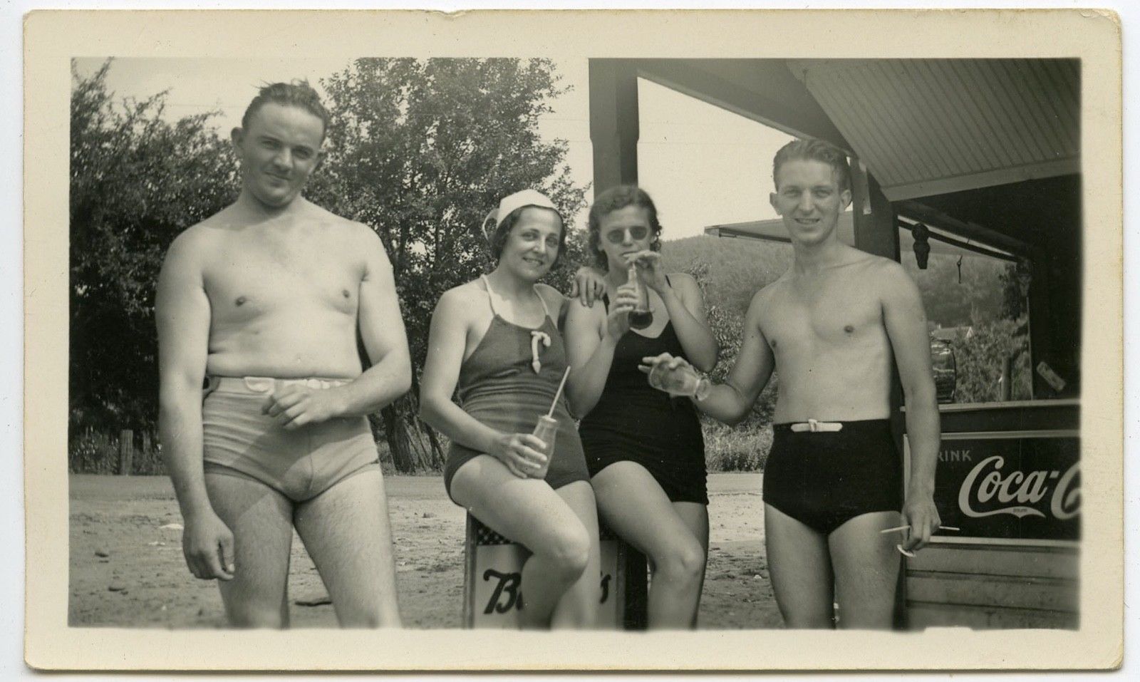 FRIENDS DRINKING COKE COCA COLA BATHING SUITS BULGE VINTAGE SNAPSHOT PHOTO
