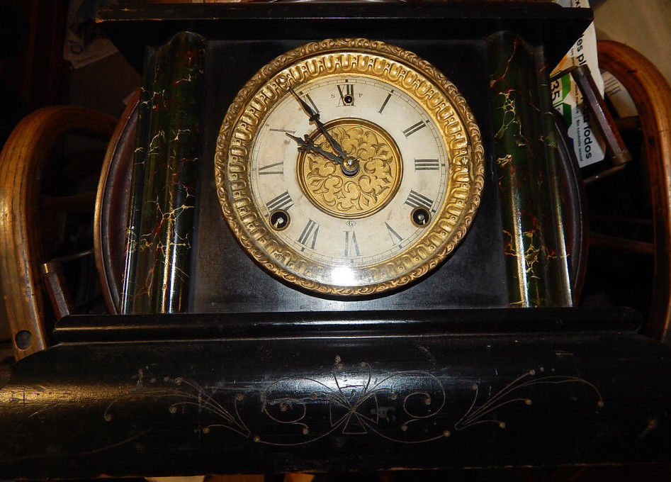 Title (ebay affiliate link): Antique 1906 GILBERT Black Ebony Victorian "Congo" Parlor Mantel Shelf Clock