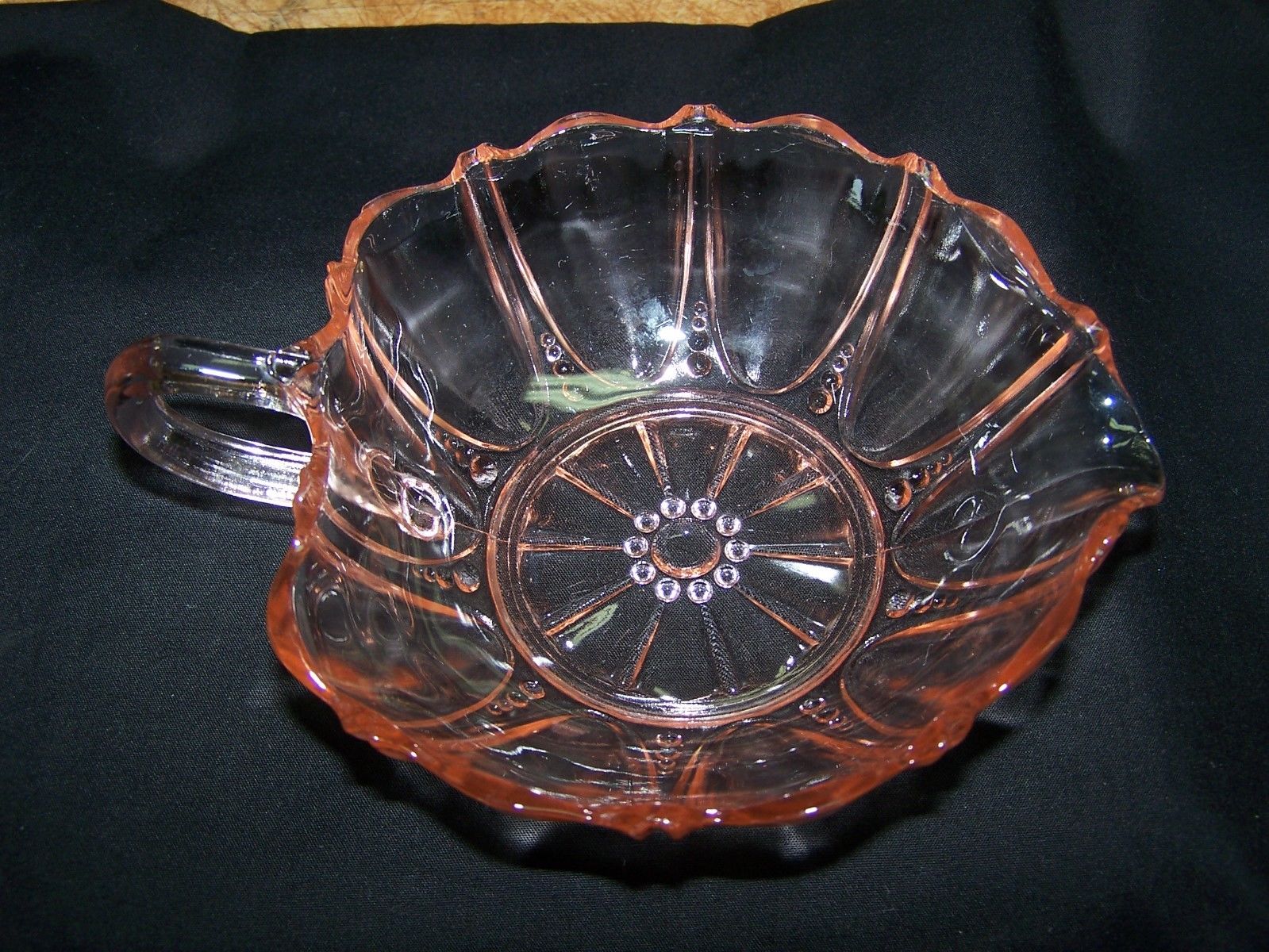 Title (ebay affiliate link): Depression Glass Pink Handel Relish Dish with Spout and Oyster Design