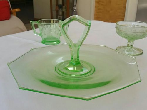 Vaseline Glass Depression Glass. Sugar bowl. Sherbet. Sandwich Plate