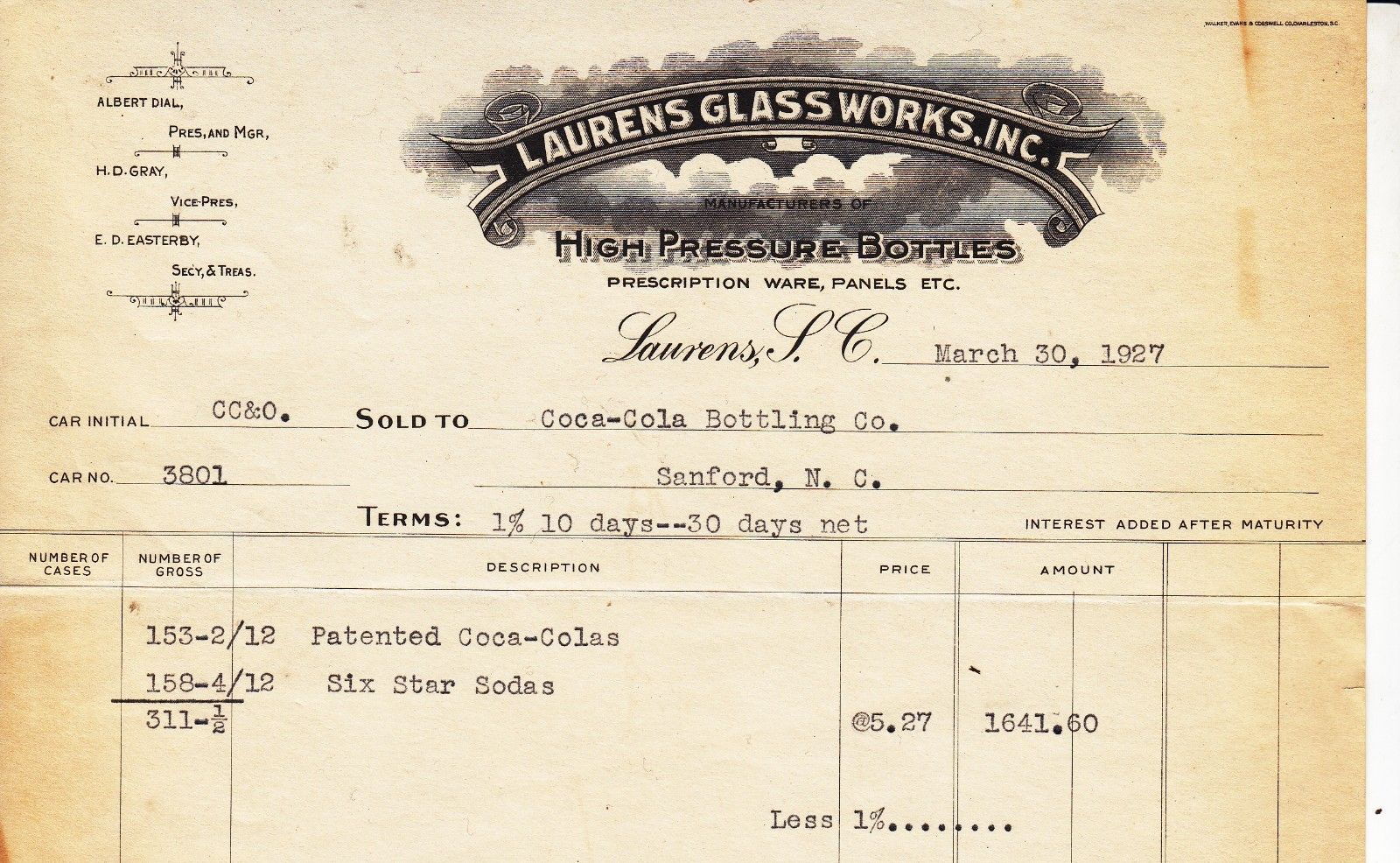LAURENS GLASS WORKS INC. LAURENS S.C. INVOICE DATED MARCH 30, 1927