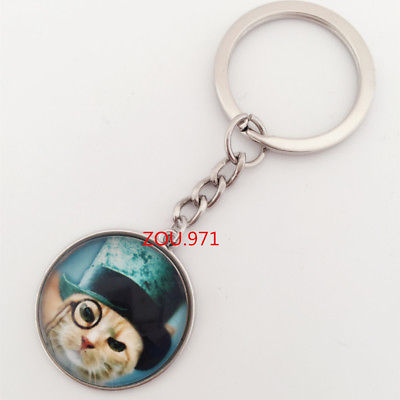 Vintage-cat-Cabochon-Glass-Tibet-Silver-Chain-Pendant-Neckl Metal Key Ring !
