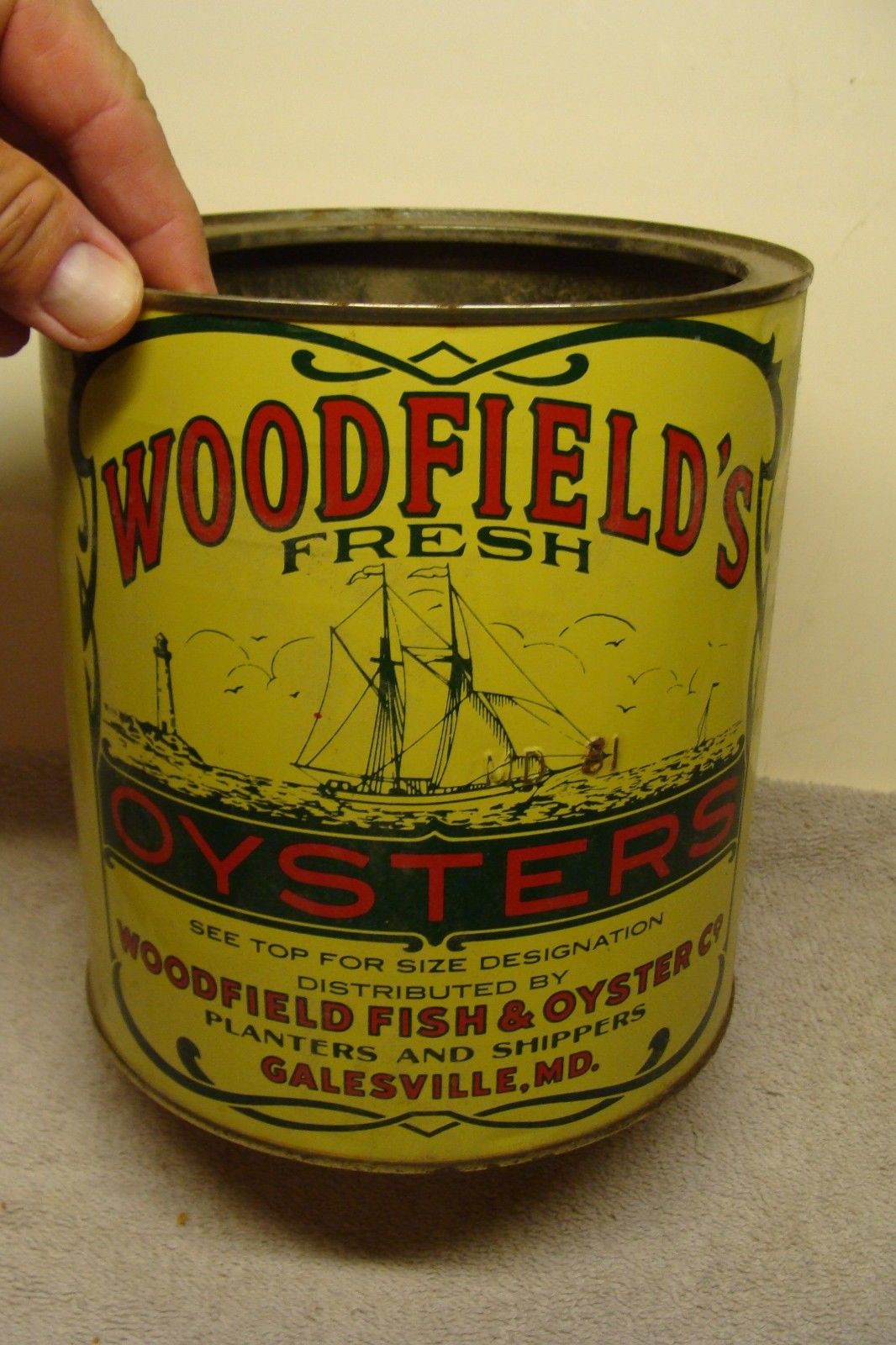 OLD WOODFIELD''S OYSTER TIN GALESVILLE CAN MD 81 GALLON MARYLAND ANTIQUE VINTAGE