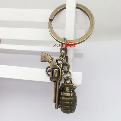 New Antique Bronze 3D Military Grenade + Gothic metal gun Pendant Keychain
