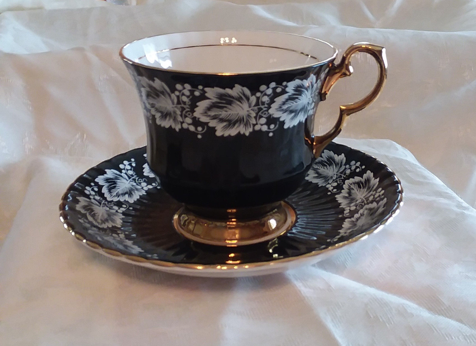 Title (ebay affiliate link): Royal windsor fine bone china tea cup and saucer, Black with gold trim.