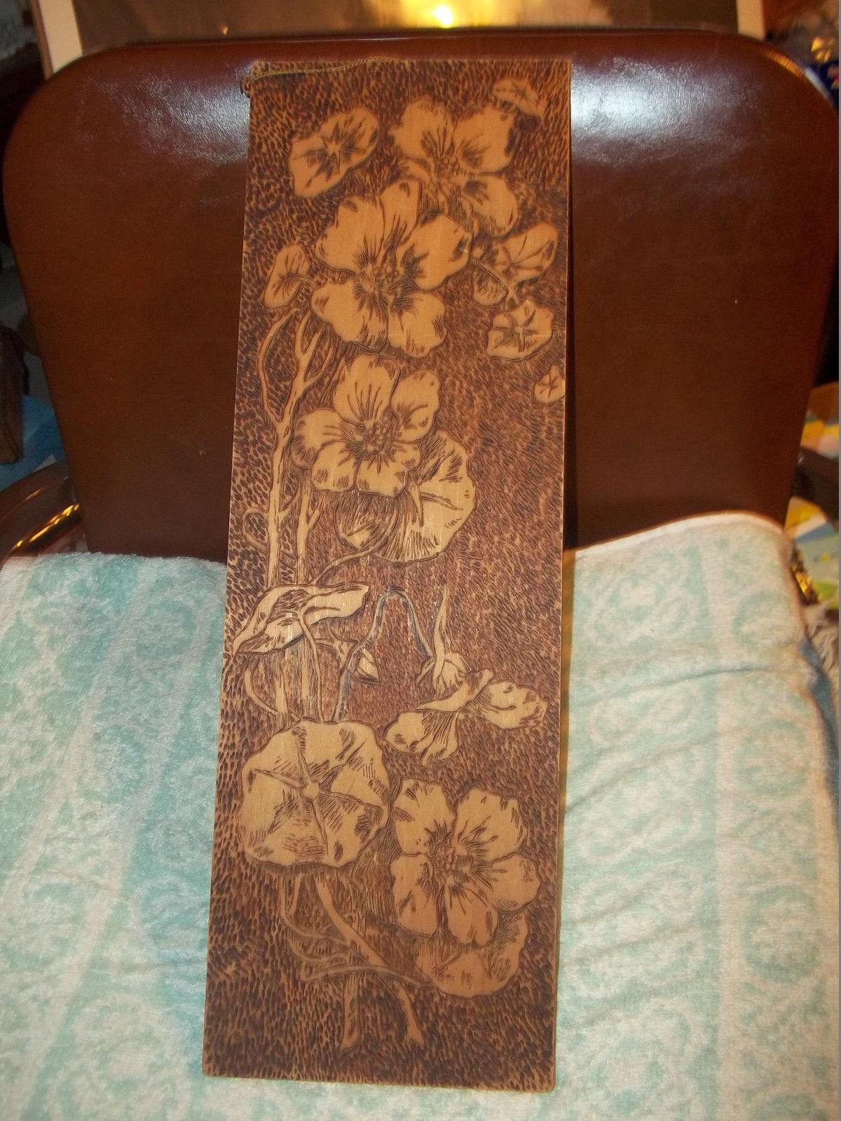 Antique Pyrography Burnt Wood Plaque Dogwood