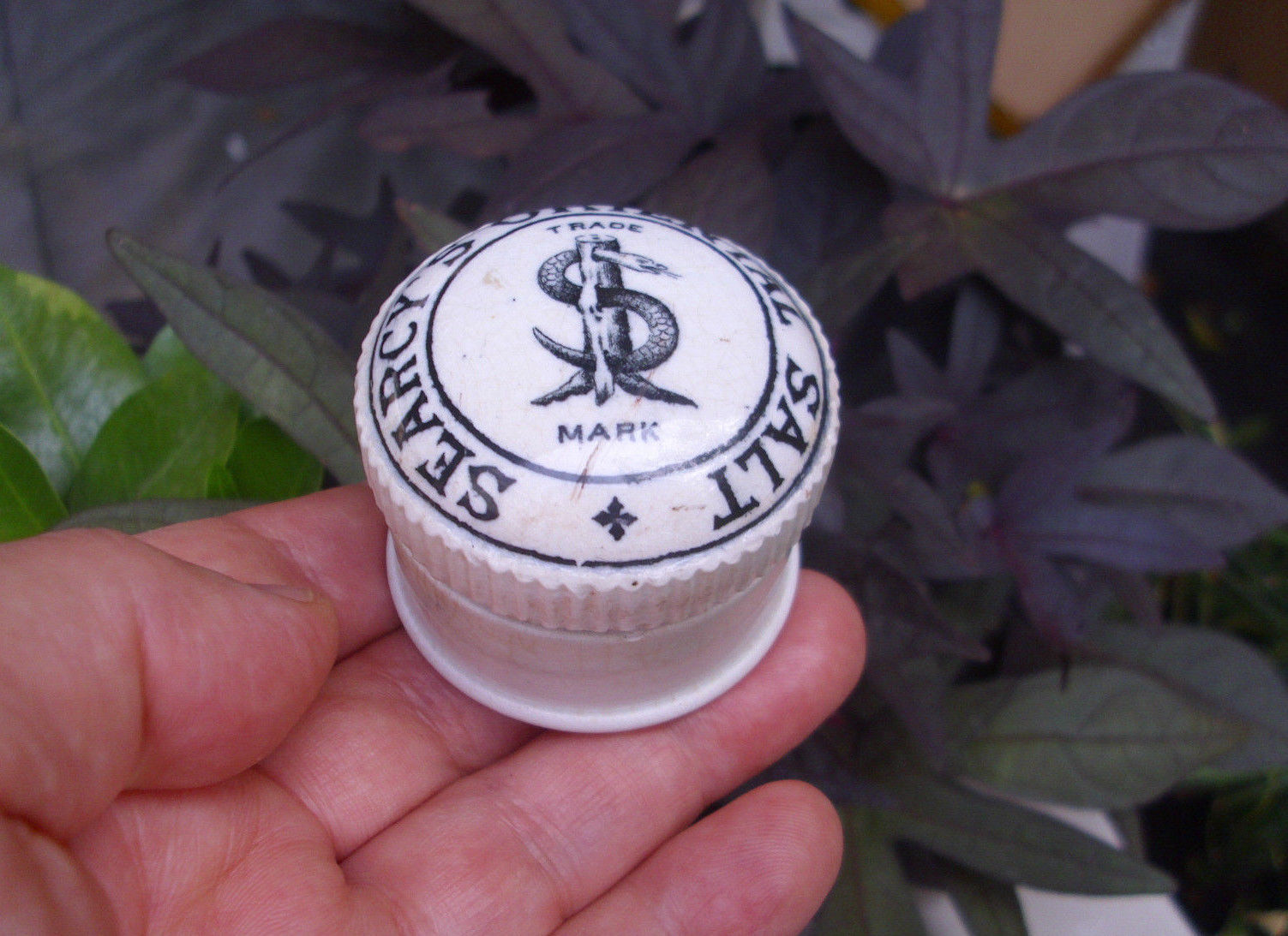 Title (ebay affiliate link): Antique, ORIGINAL, c1890''s under-glaze advertised Searcy''s Oriental Salt pot lid