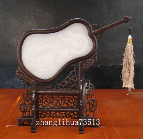 Title (ebay affiliate link): 100% Handmade Carving Wood Natural White Jade Inlaid Screen Two Dragon Deco Art