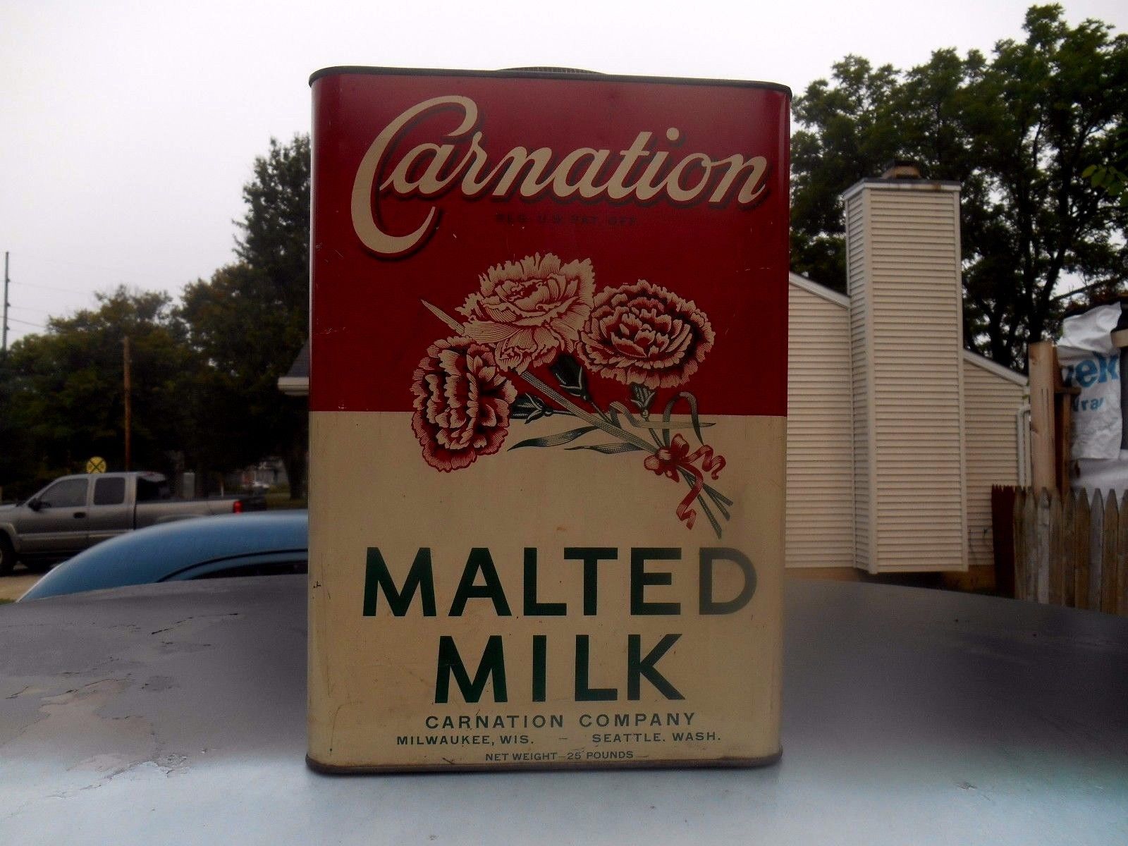 Title (ebay affiliate link): VINTAGE CARNATION MALTED MILK TIN 25 LBS GENERAL STORE COUNTRY NICE