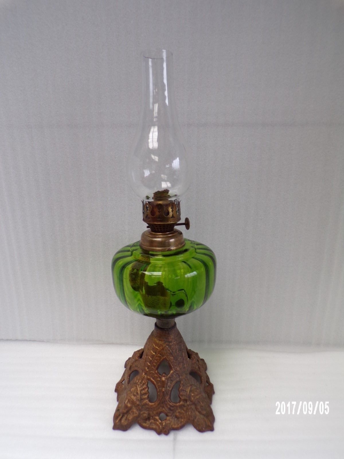 Title (ebay affiliate link): Antique English, Victorian Oil Lamp, Green Font & Neoclassical Cast Iron Base.