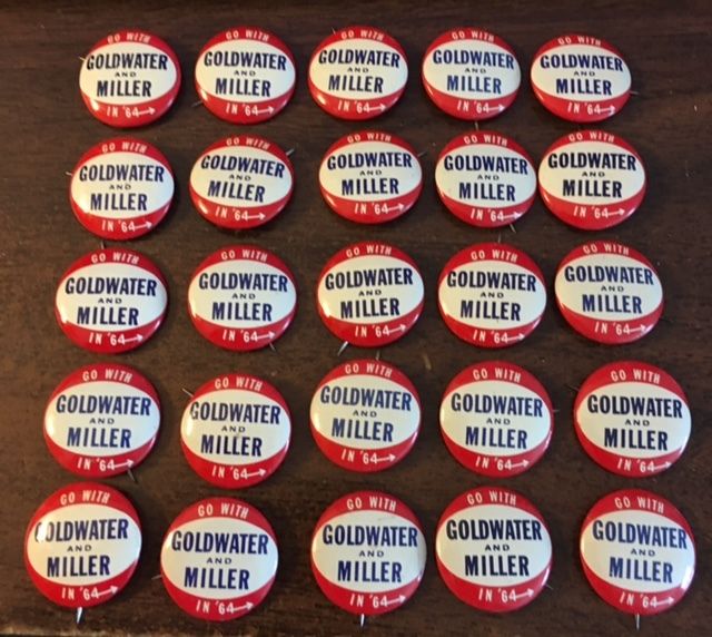 Title (ebay affiliate link): Twenty-Five 1 1/8" Go With Goldwater and Miller in ''64 Political Pinback Buttons