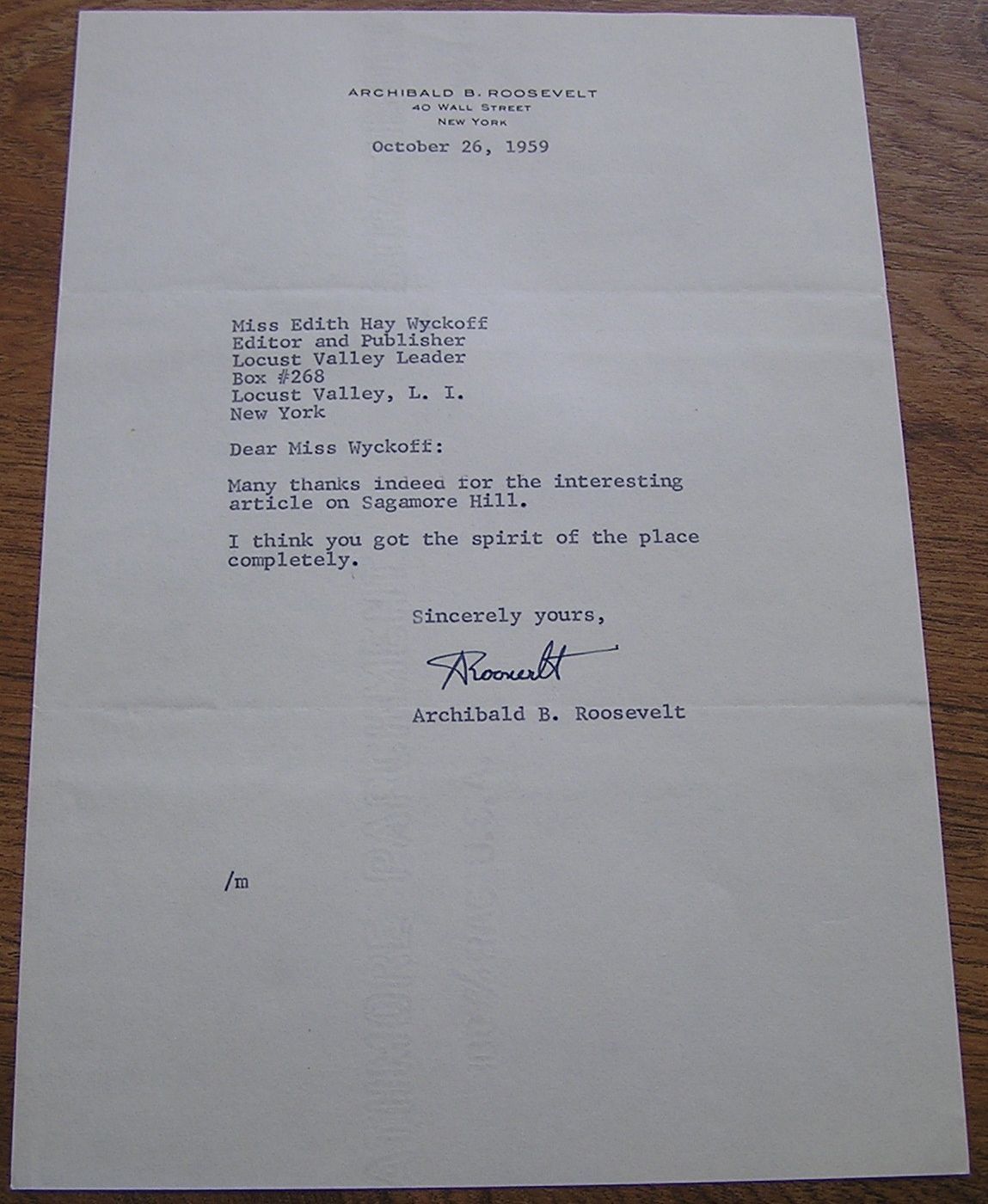 PRESIDENT TEDDY ROOSEVELT''S SON ARCHIBALD AUTOGRAPHED LETTER 1959 WAR HERO
