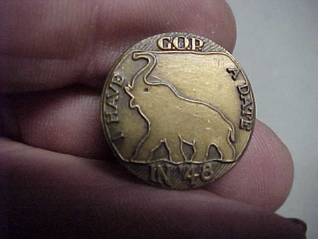 Title (ebay affiliate link): Brass pinback button-GOP-"I have a date in ''48" with elephant-Neat!