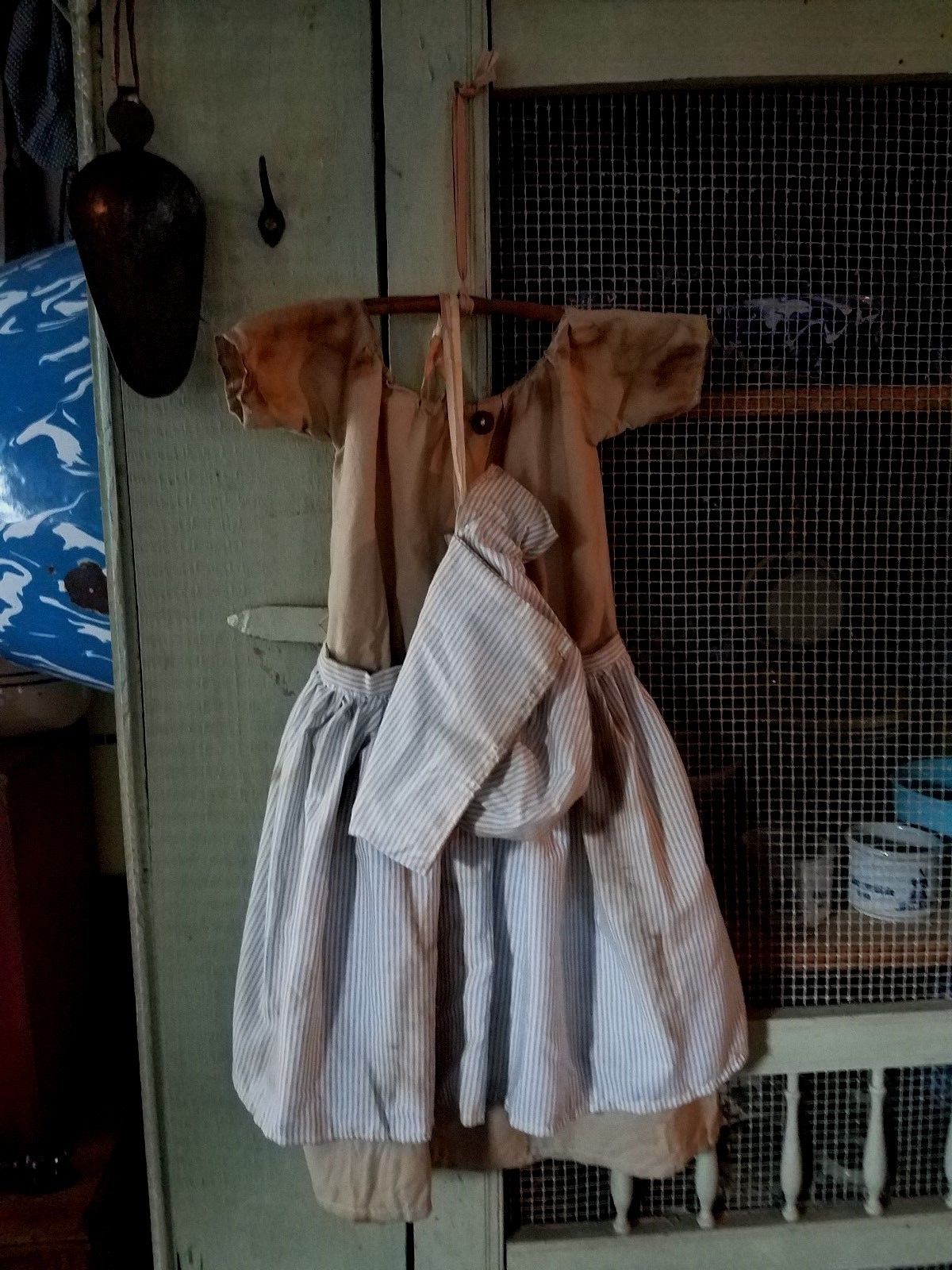 Title (ebay affiliate link): Primitive Aged Prairie Pioneer Child''s Dress, Apron and Bonnet Cotton Ticking