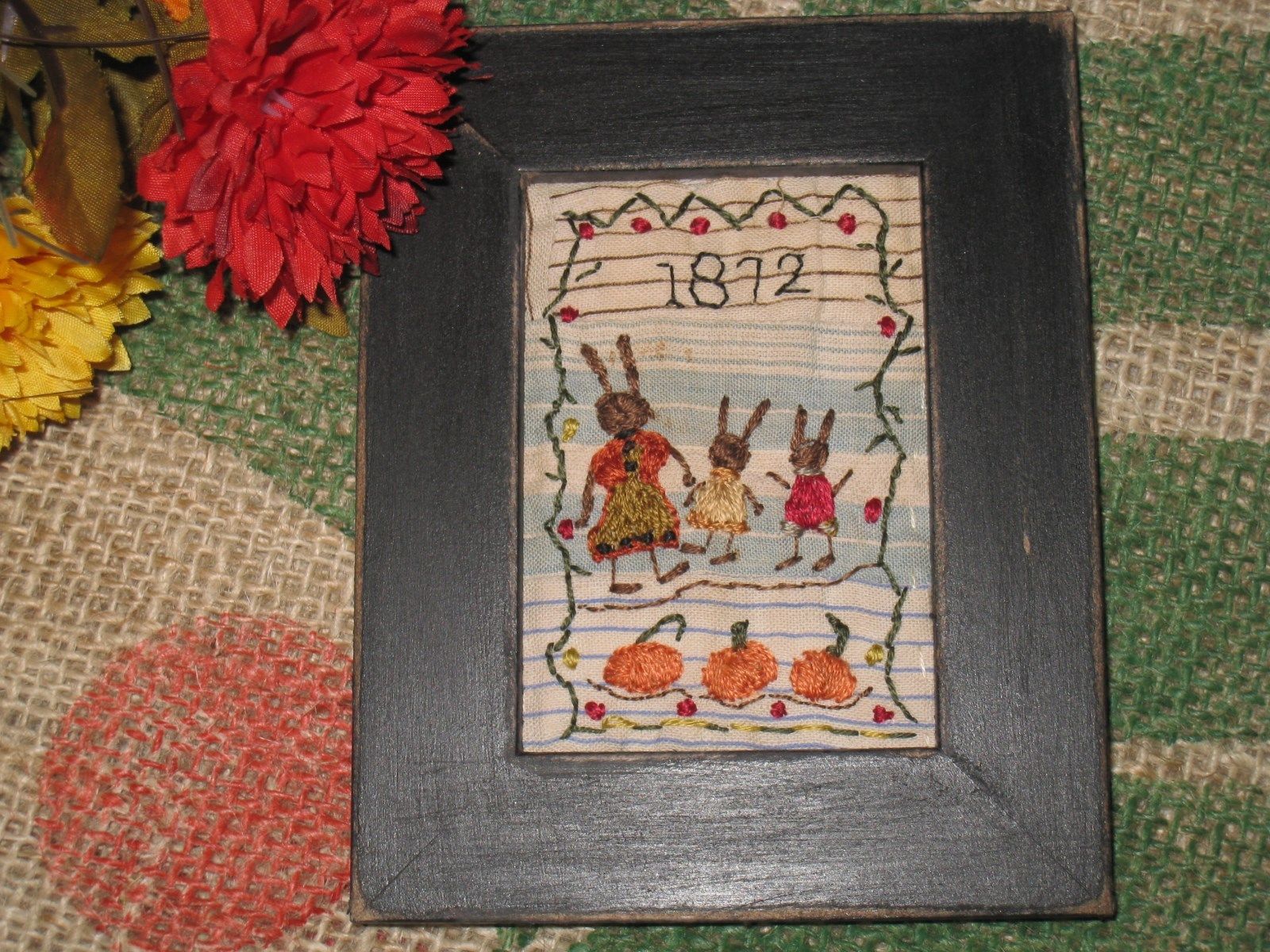 Title (ebay affiliate link): Primitive tiny Sampler on Antique Quilt~1872 Rabbits Pick Pumpkins~ Folk Art