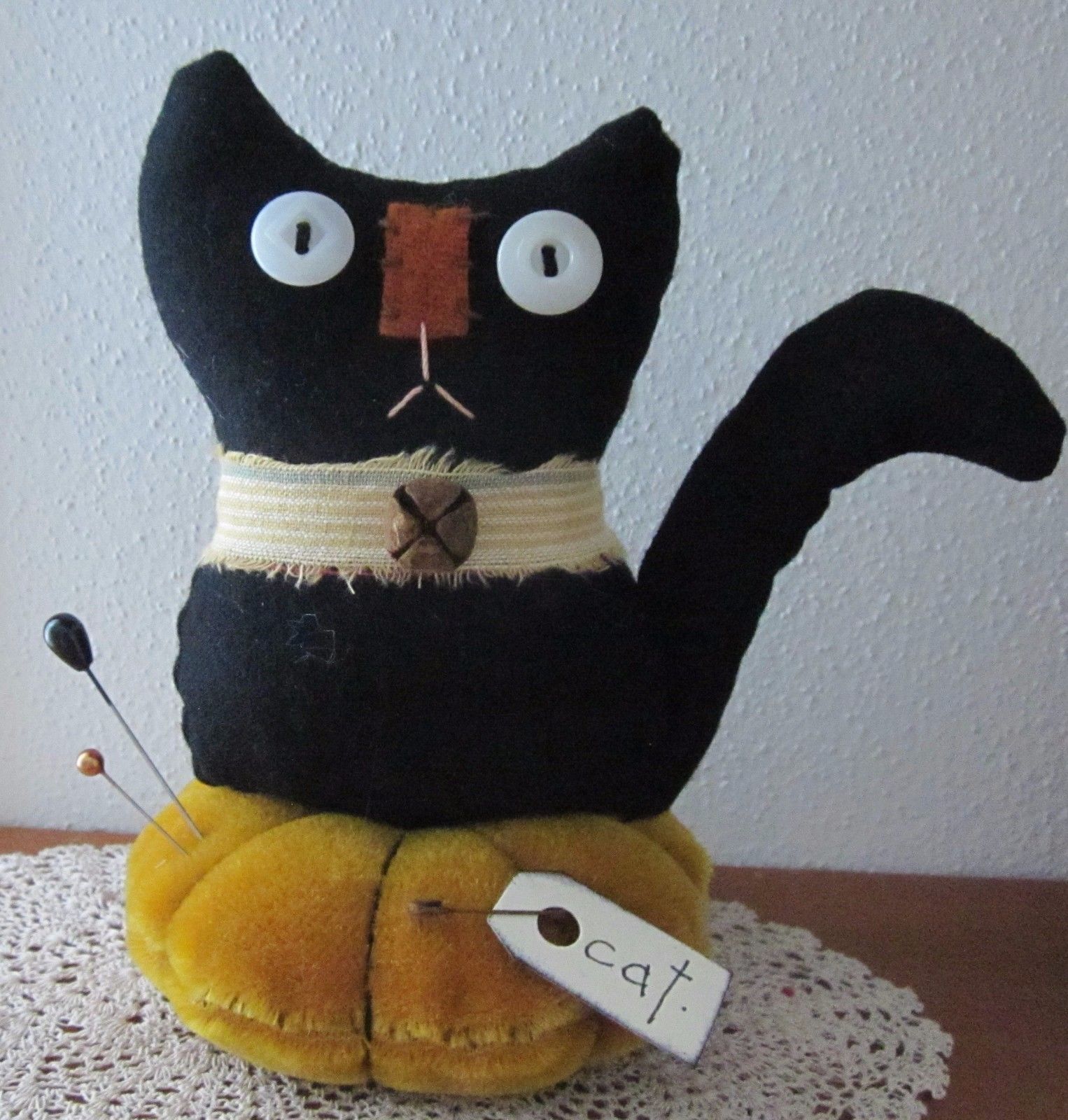 Title (ebay affiliate link): PRIMITIVE WOOL MOHAIR BLACK CAT HALLOWEEN MAKE DO DOLL PIN CUSHION PFATT EHAG