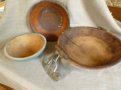 3 Country Old Wood Bowls and Chopper