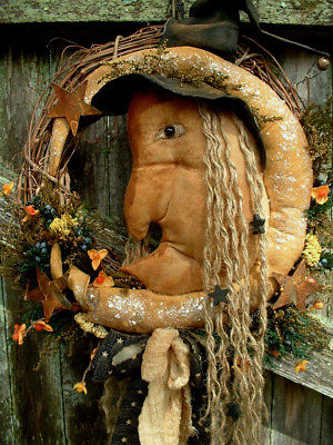 Title (ebay affiliate link): PRIMITIVE FALL~HALLOWEEN~WREATH~WITCH IN THE MOON~WALL/DOOR HANGER