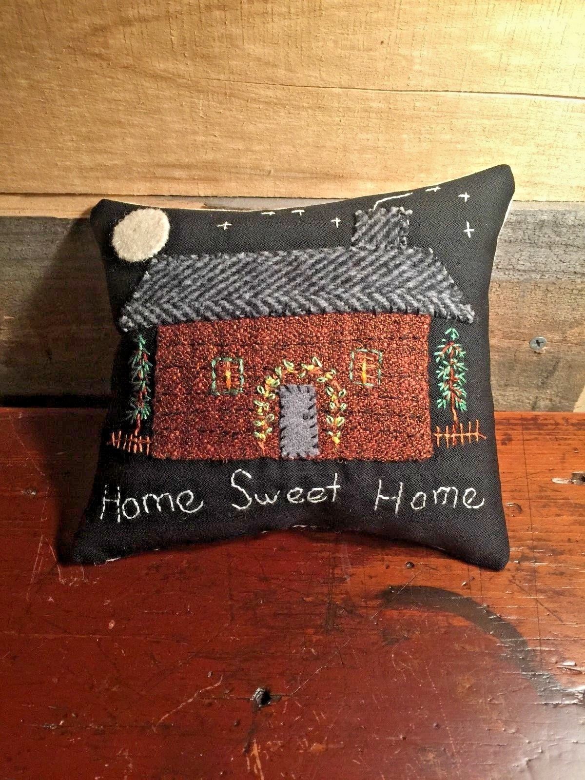 Title (ebay affiliate link): Primitive Stitchery Pillow Ornie Home Sweet Home Cabin OOAK