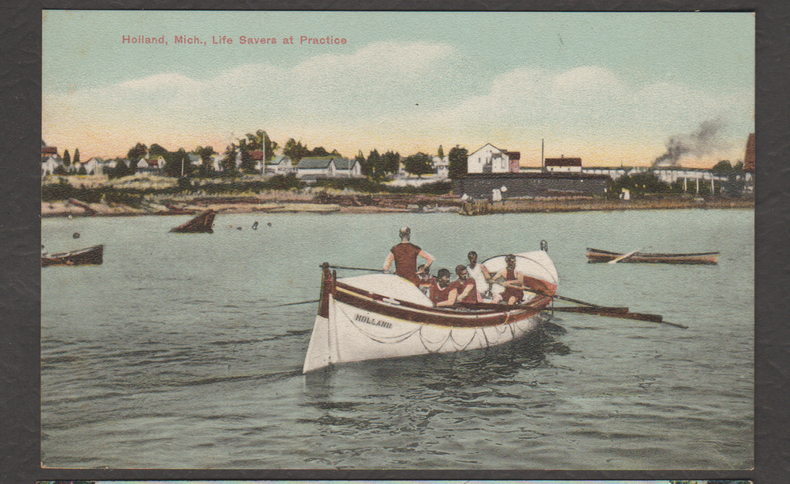 Title (ebay affiliate link): Holland, Mi/ Life Savers at practice/ men in row boat/ non-linen postcard