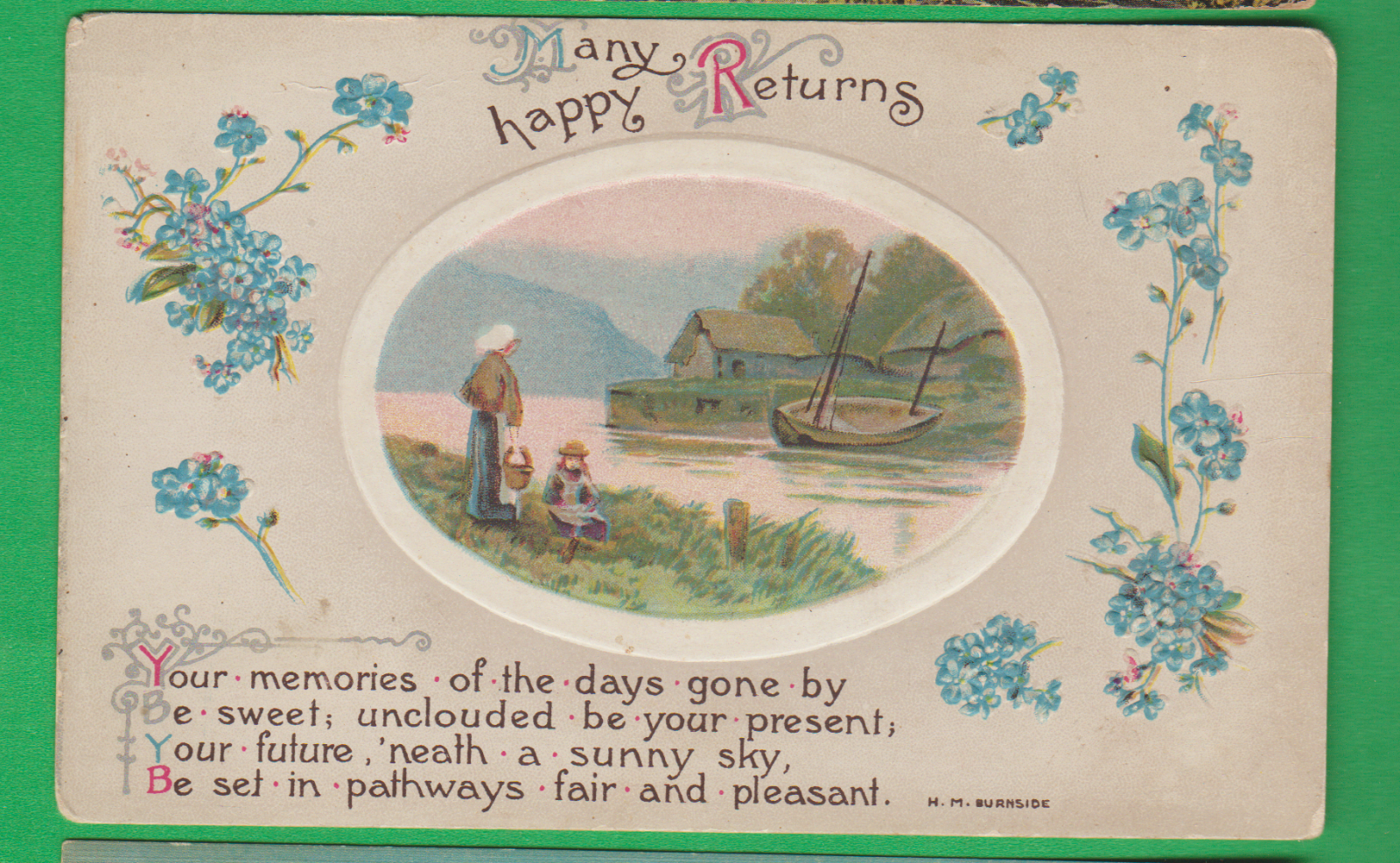 Greetings embossed postcard/ lady looking at water & boat/ blue flowers/poem