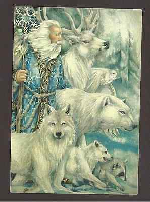Santa Claus with White Wild Animals, Bear, Wolf, Deer, Postcard, Carte Postale