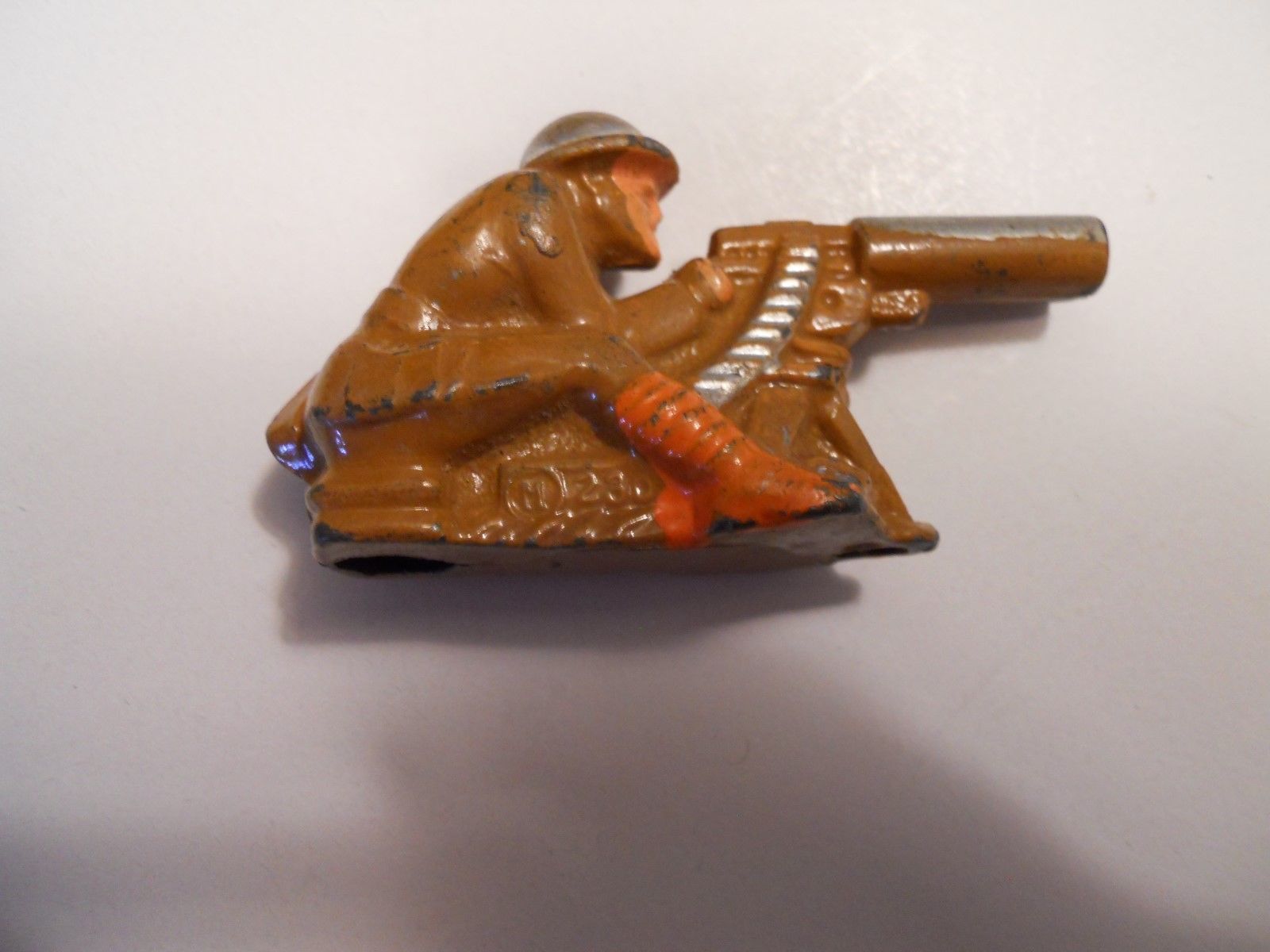 Title (ebay affiliate link): VINTAGE WWII MANOIL METAL TOY - MANOIL SITTING MACHINE GUNNER - #23