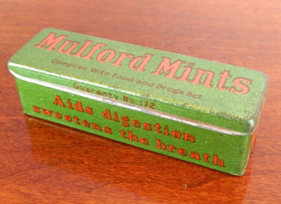Title (ebay affiliate link): Vintage MULFORD MINTS Metal Tin Box Trinket Holder Green & Red 2 11/16" long