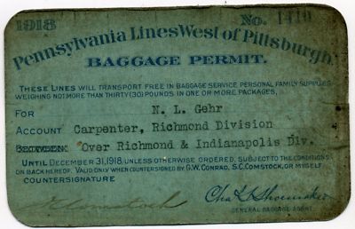 Title (ebay affiliate link): 1918 Pennsylvania Railroad Baggage Permit Mr. N.L. Gehr
